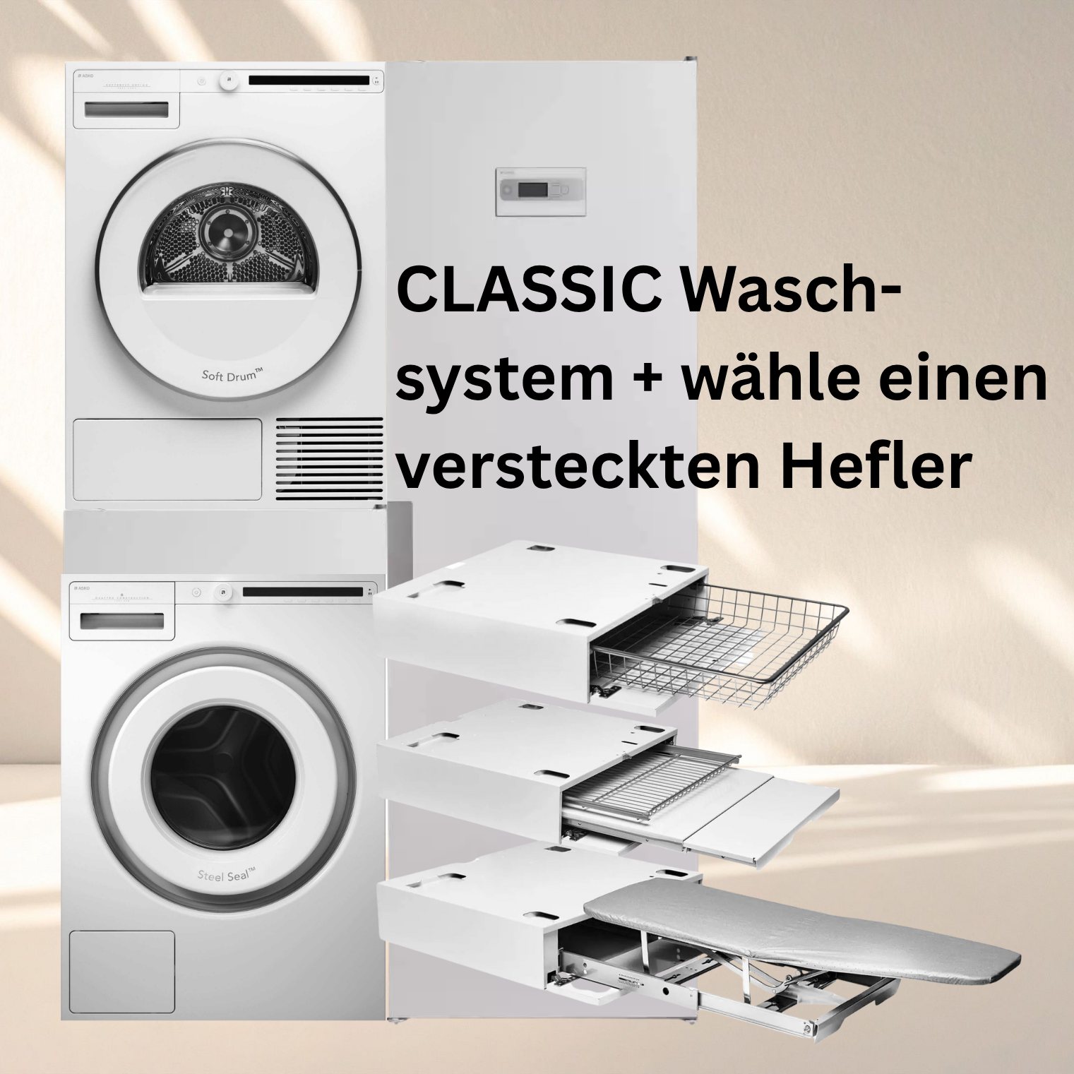 Mit diesem Classic Waschsystem deckst du den kompletten Weg deiner Wäsche ab: waschen, tumblern und schonend hängend trocknen – alles mit aufeinander abgestimmten ASKO Geräten. Die 8 kg Waschmaschine und der 8 kg Wärmepumpentrockner bilden einen kompakten Waschturm, während der Trockenschrank DC7784HP.W zusätzliche Kapazität für empfindliche Textilien, Schuhe, Outdoorbekleidung, Arbeitskleidung und alles, was du nicht im Tumbler trocknen möchtest, bietet.