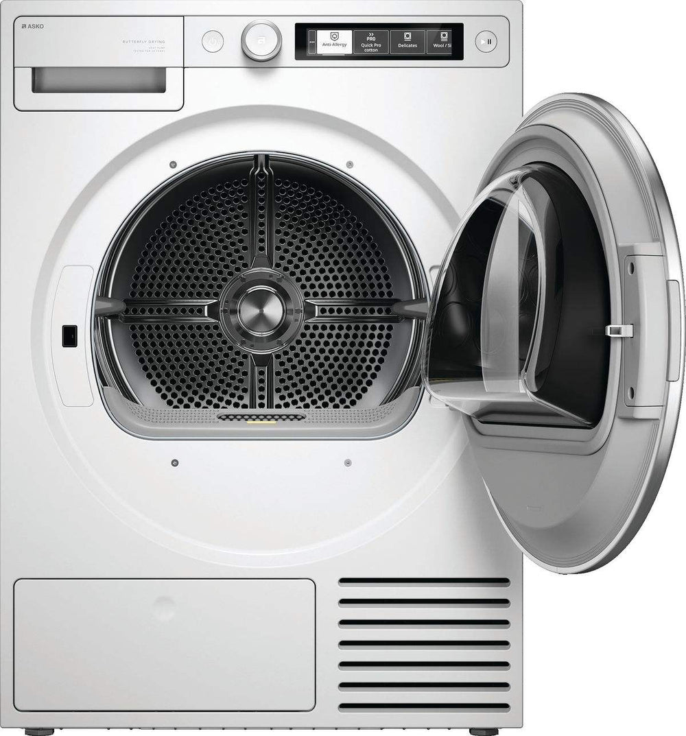 Der ASKO T 509HR W aus der hochwertigen Style-Serie ist ein Premium-Wärmepumpentrockner, der modernste Technologie mit maximalem Komfort verbindet. Mit einer Kapazität von 9 kg bietet er viel Platz für grosse Wäscheladungen und trocknet diese dank der effizienten Wärmepumpentechnologie besonders schonend. Ein absolutes Highlight dieses Modells ist der integrierte Dampferzeuger, der Ihre Kleidung auffrischt und entknittert. Die Bedienung über das elegante TFT-Farbdisplay und die extrem leise Arbeitsweise von nur 59 dB(A) machen ihn zur perfekten Wahl für anspruchsvolle Haushalte.